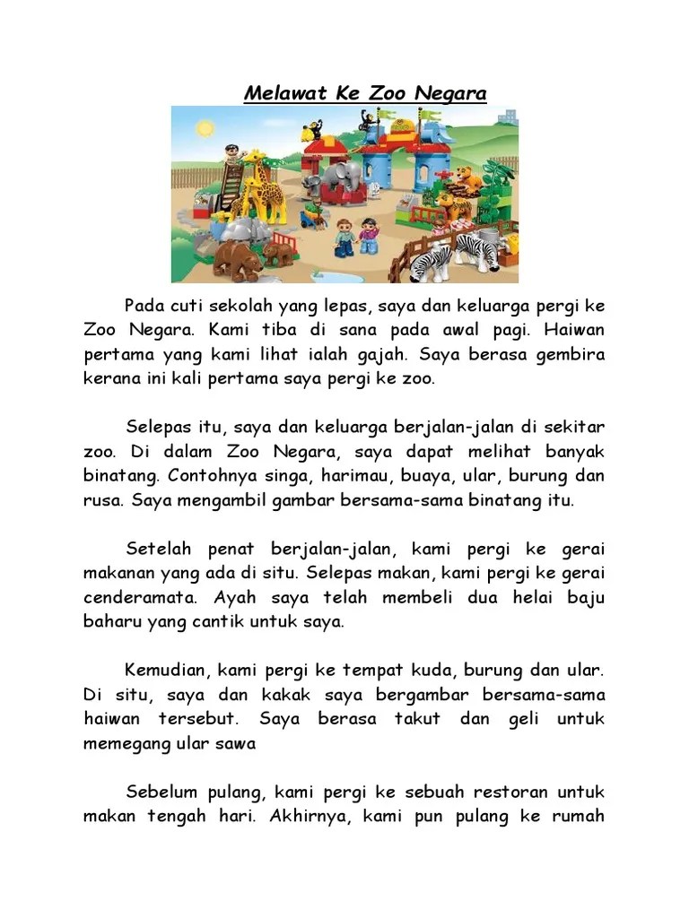 Pada masa cuti sekolah yang lalu, sekolah saya telah mengadakan suatu lawatan . Pada cuti sekolah yang lalu,saya sekeluarga pergi melawat ke zoo taiping.perjalanan dari rumah saya mengambil masa lebih kurang 1 jam untuk . Contoh karangan upsr melawat ke zoo negara. Seramai 60 orang murid dan 3 orang guru telah mengikut rombongan ini. Kami bertolak ke sana pada pukul. Pada cuti sekolah yang lepas, saya dan keluarga pergi ke.